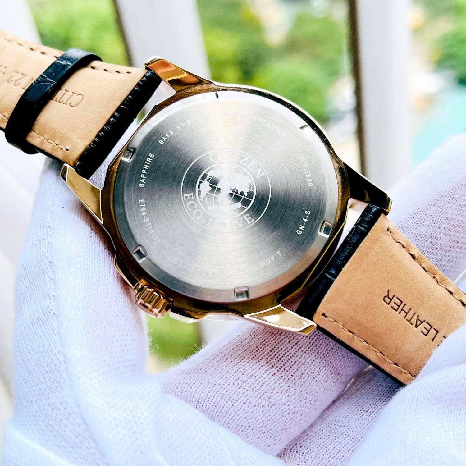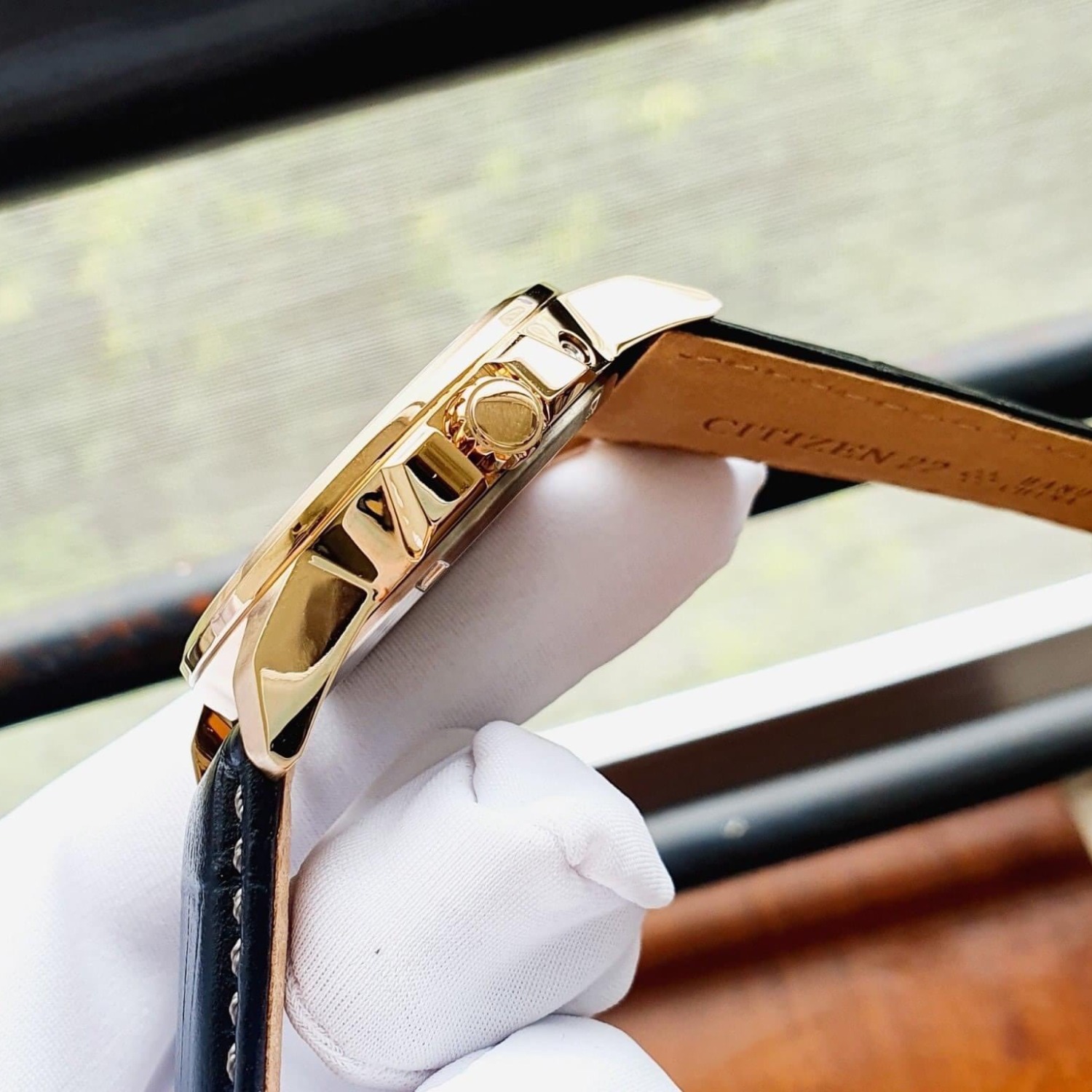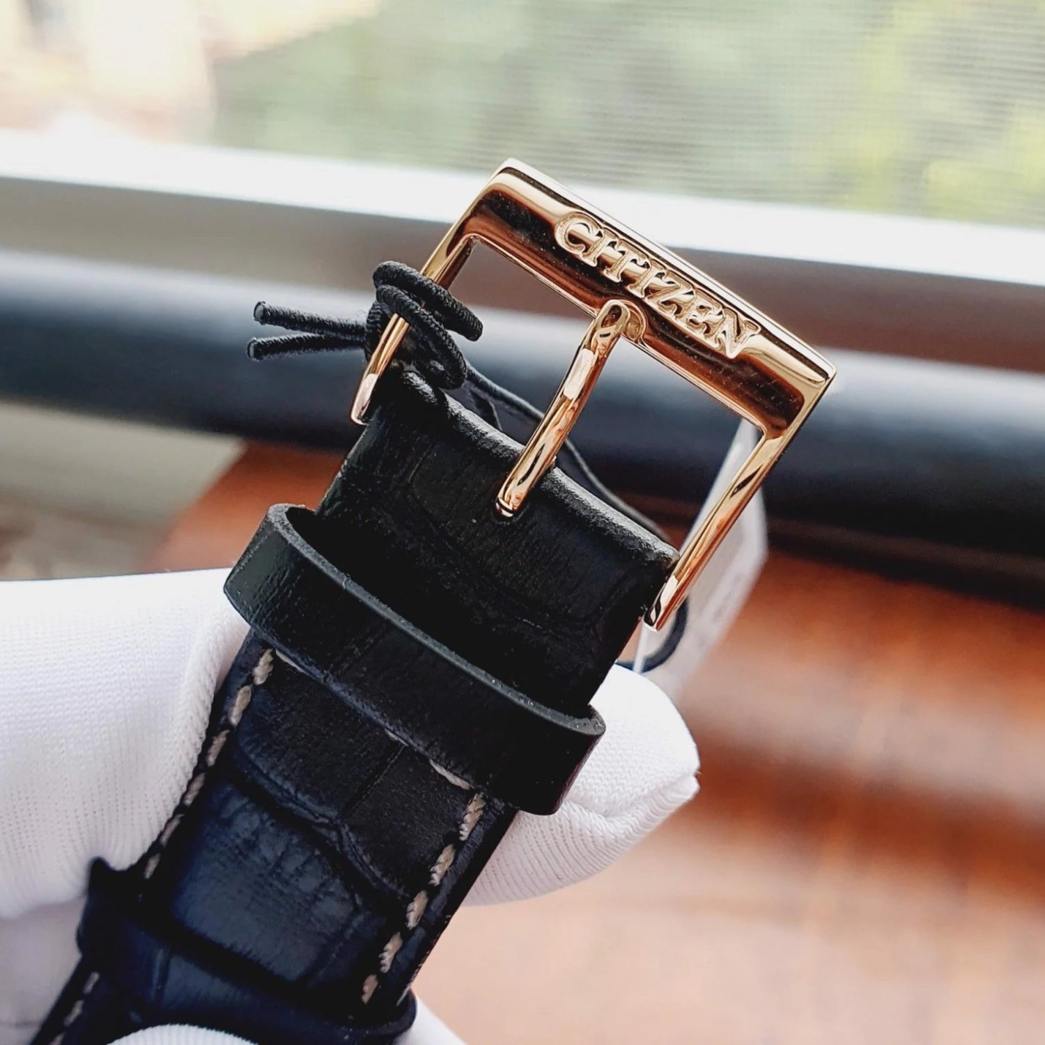 - Vỏ thép mạ vàng hồng, dây da đen