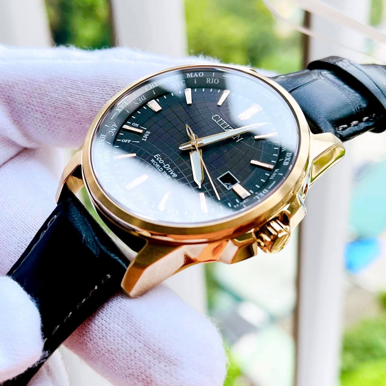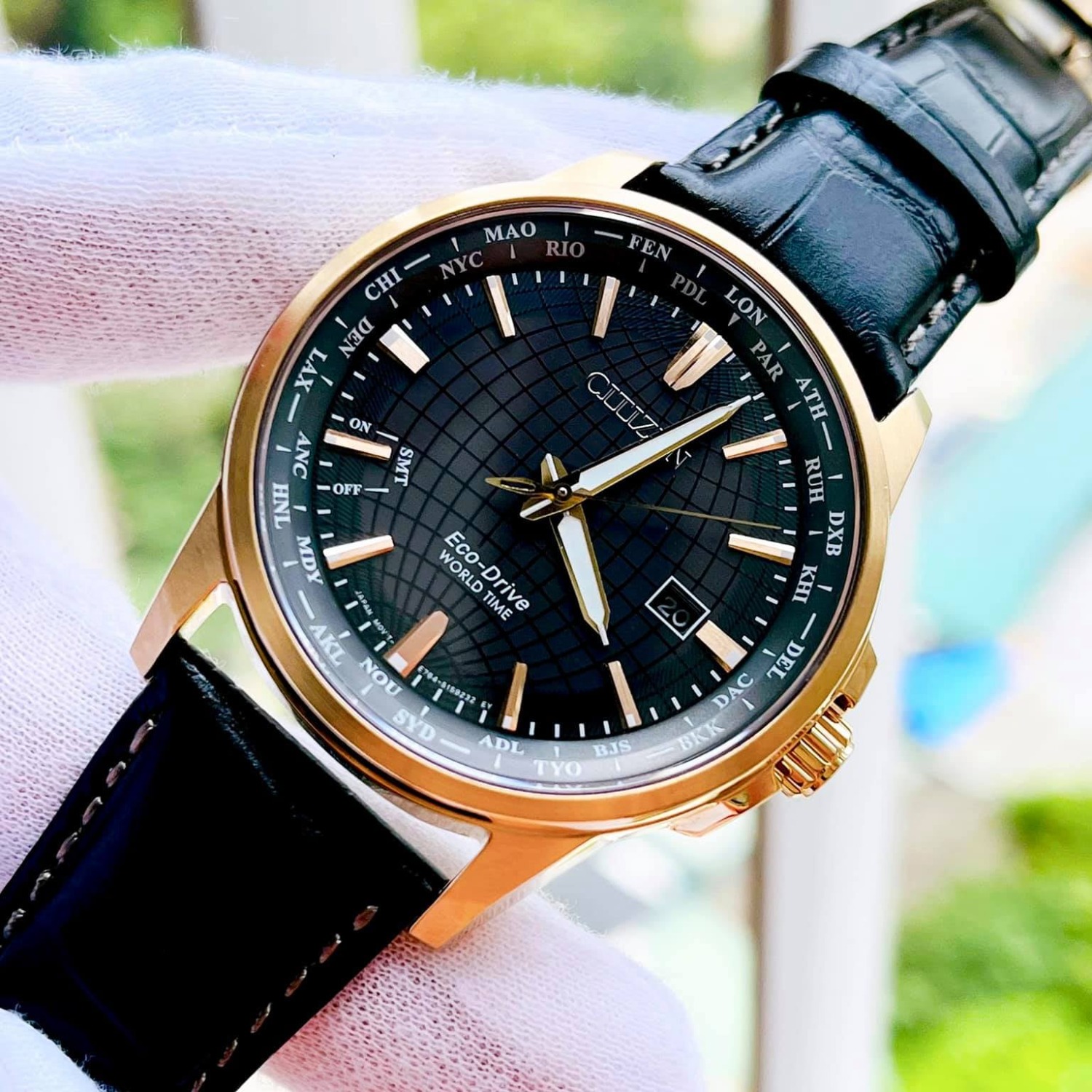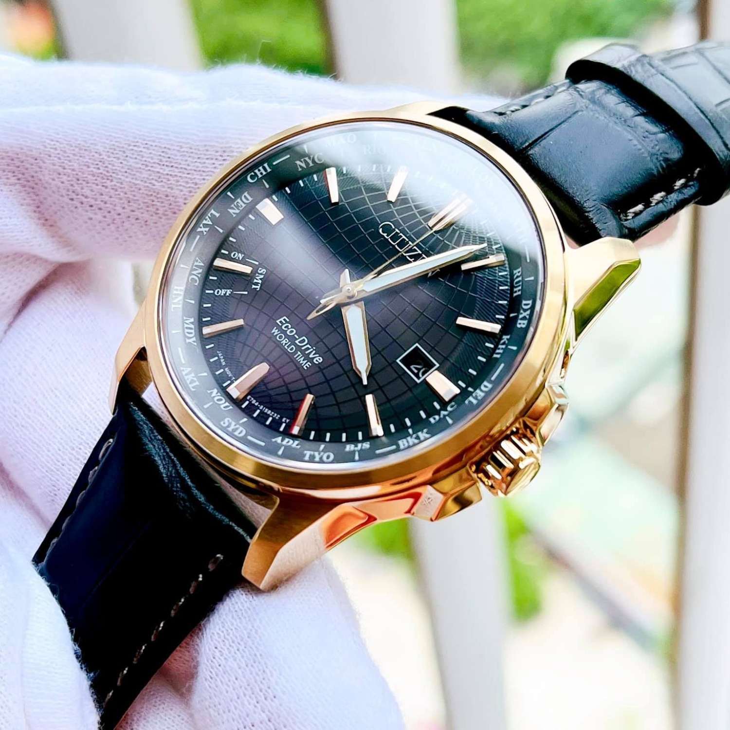 - Vỏ thép mạ vàng hồng, dây da đen