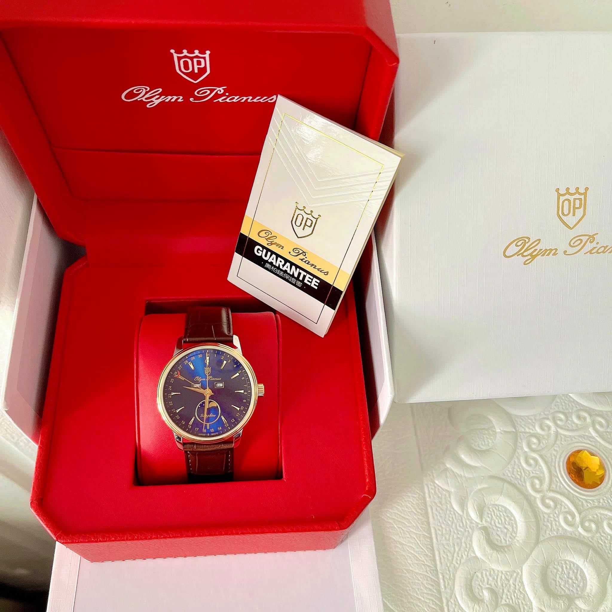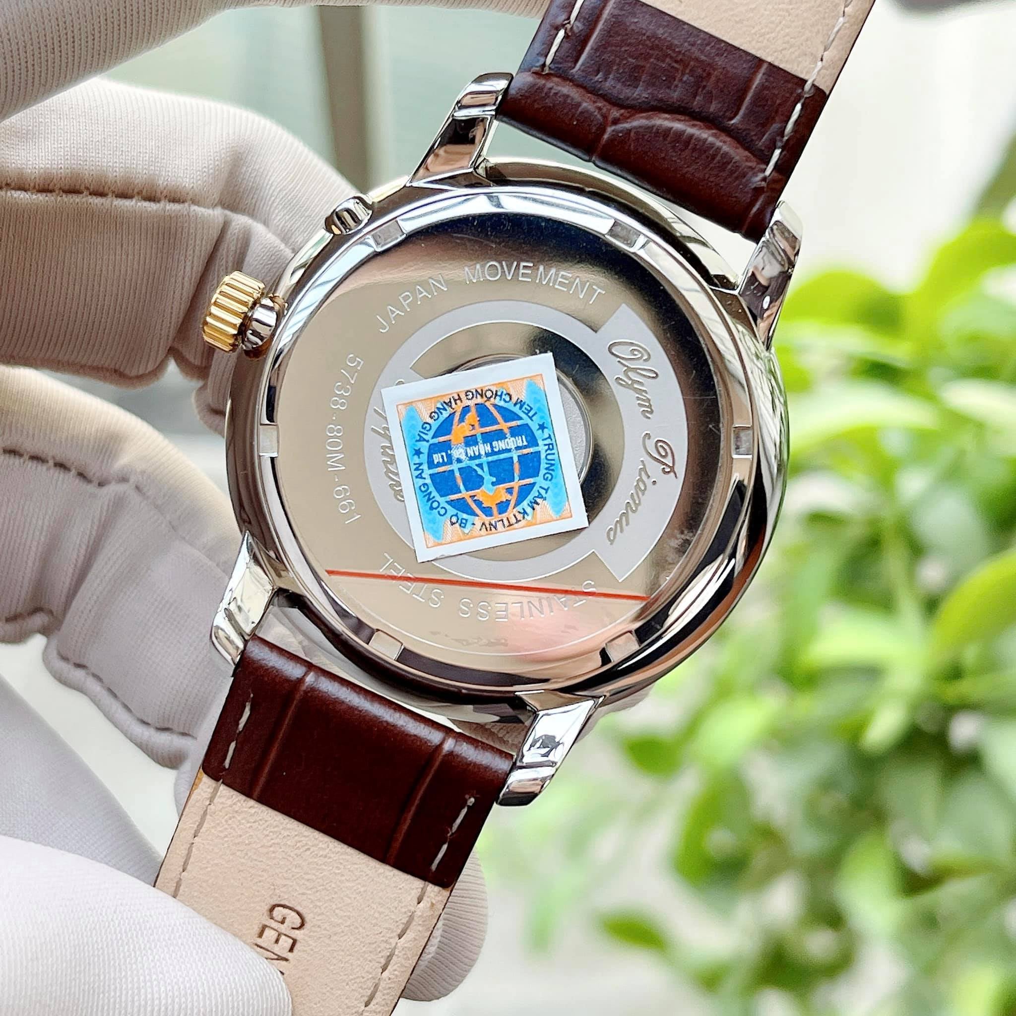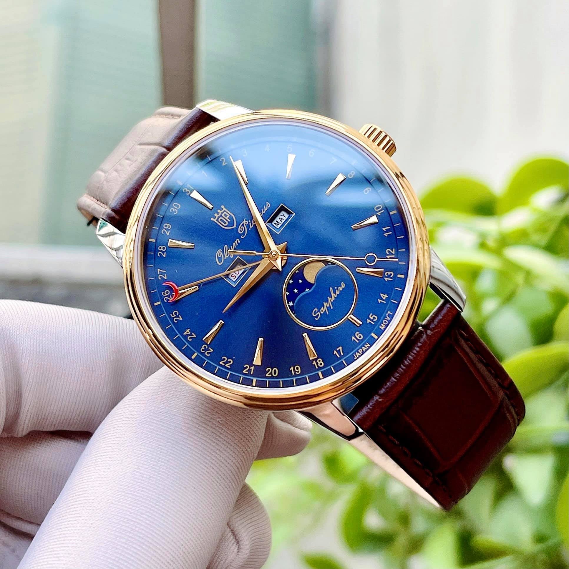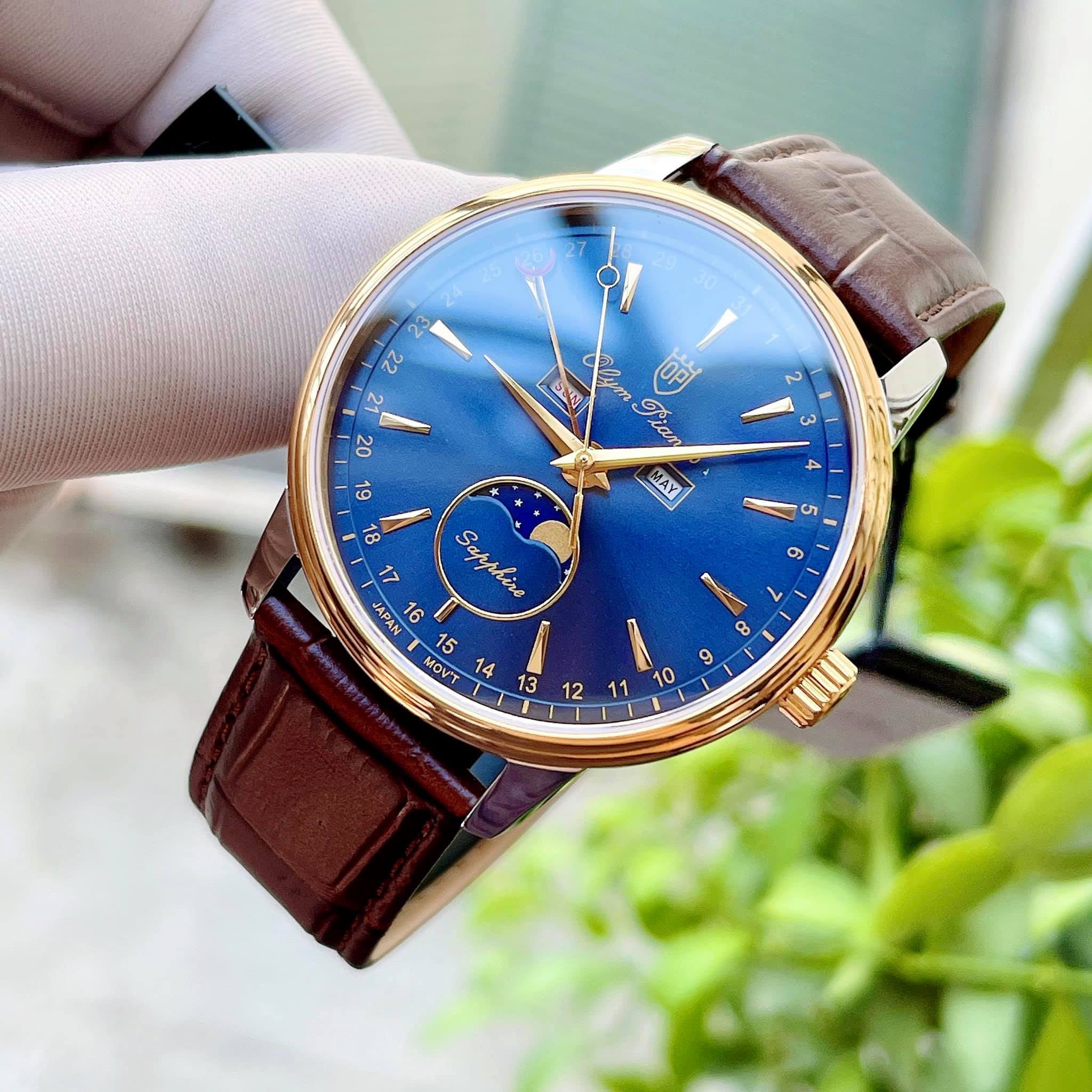Thiết kế sang trọng với tông gold và dây da, dial có lịch sun and moon, kim lịch ngày trăng khuyết, hiển thị full chức năng: thứ, ngày, tháng.