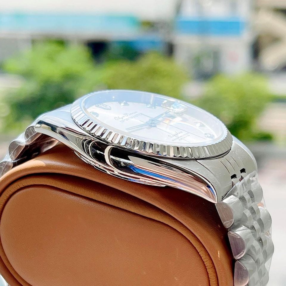 Tông màu trắng, cọc số đính đá, lịch giờ giọt nước, niềng cắt khía, tổng hòa đã tạo nên một chiếc đồng hồ bắt mắt và sang trọng ![]()