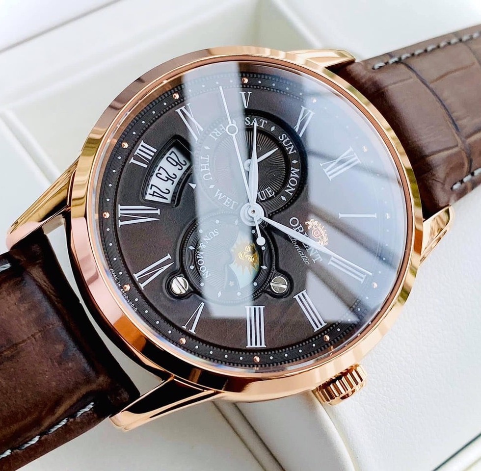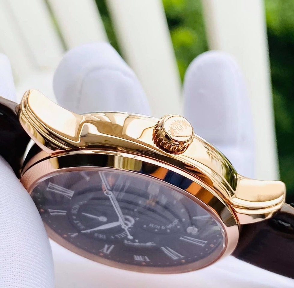 Mặt dial màu nâu cafe sang trọng, lịch lãm, đầy đủ lịch thứ ngày, đặc biệt là điểm nhấn ô lịch sun and moon trứ danh.