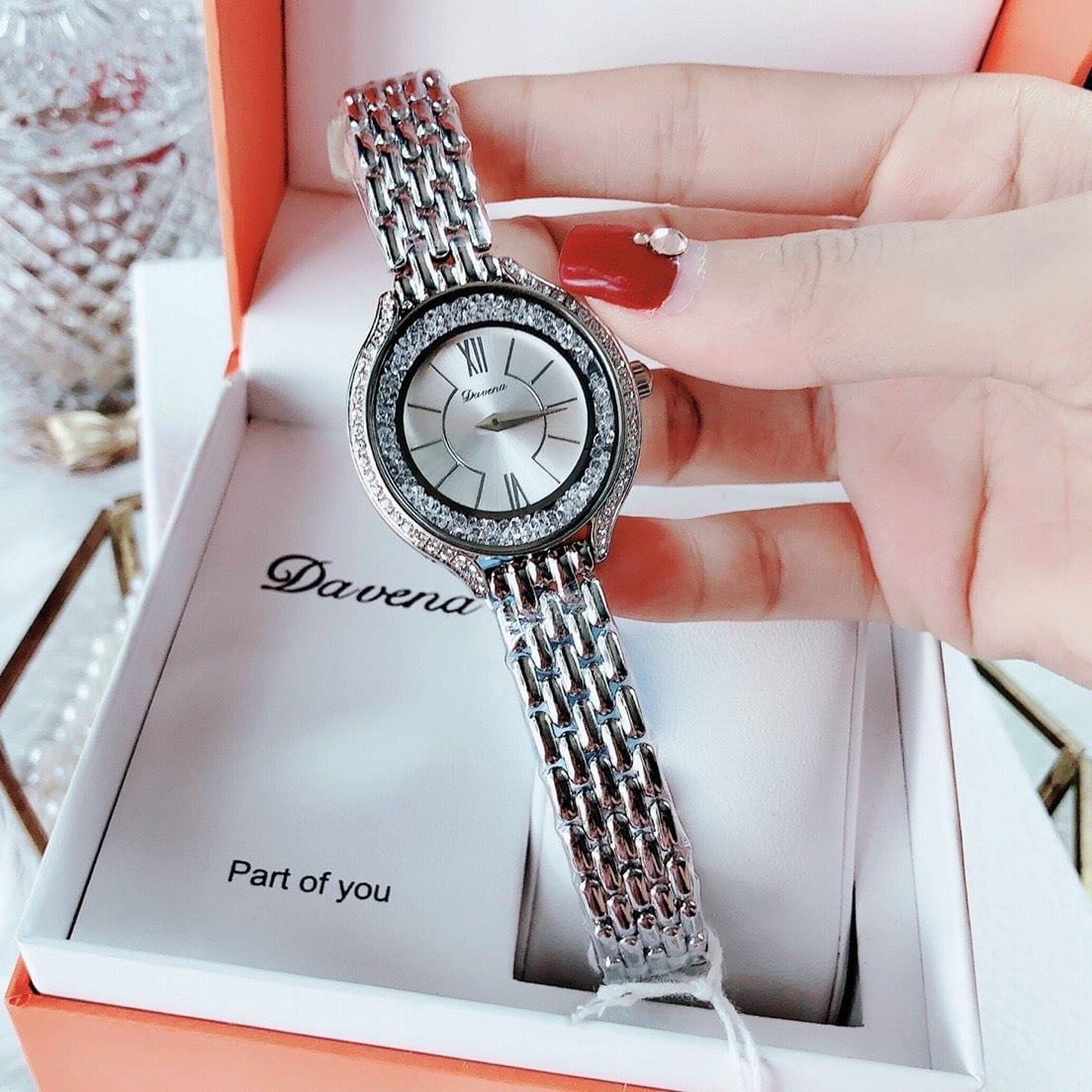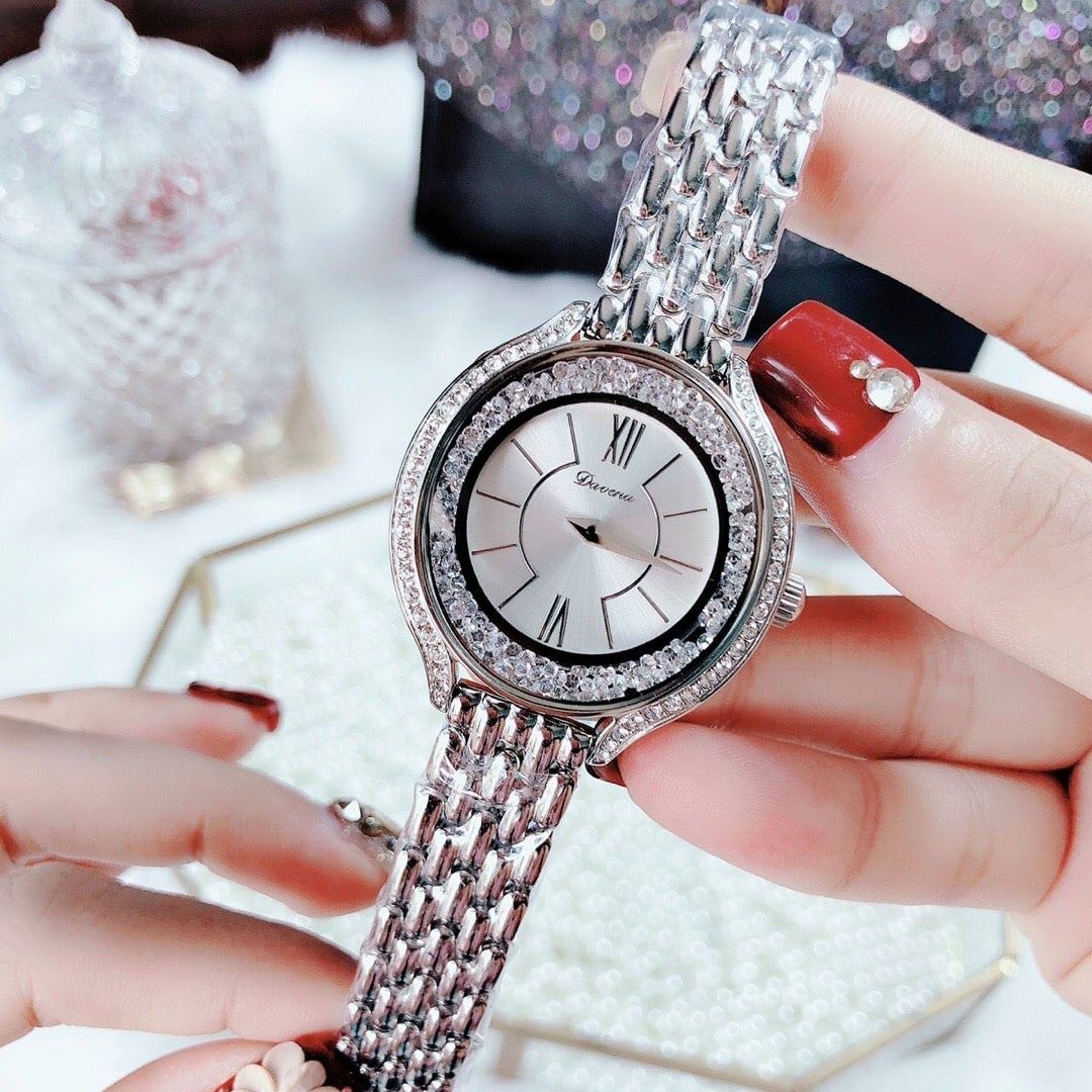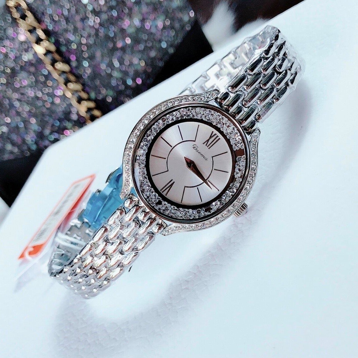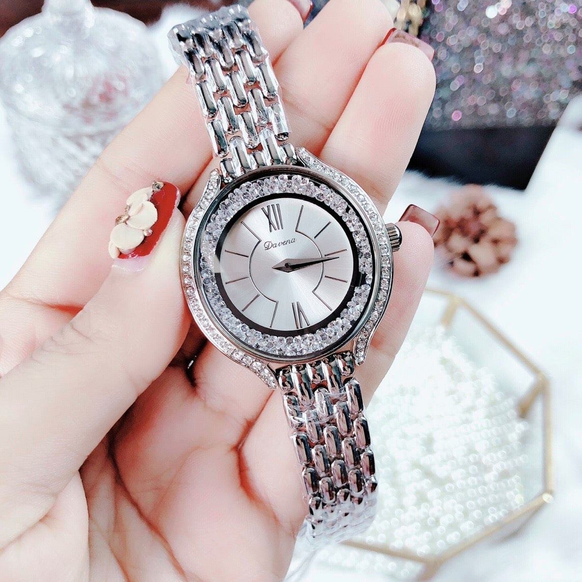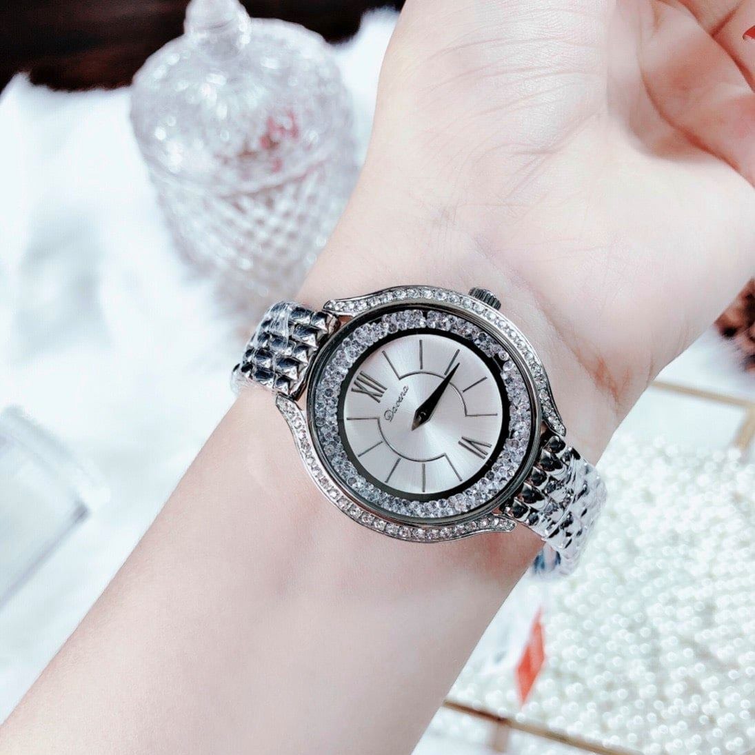 Viền đá swarovski siêu nổi, Thiết kế đá 2 vành bo tròn quanh mặt sáng long lanh.